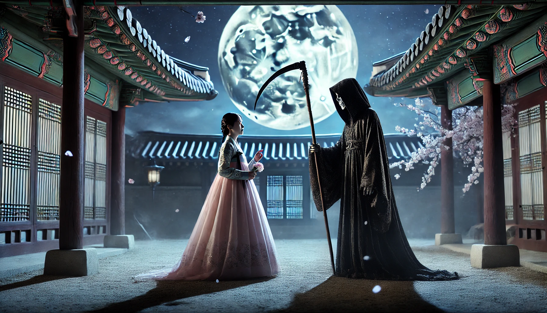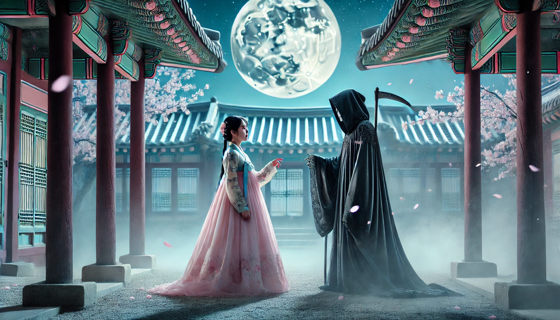 사자는 고개를 끄덕였다. 두 사람은 천천히 방을 나섰다. 밖은 이미 밤이었고, 보름달이 하늘 높이 떠 있었다. 달빛을 따라 나타난 길이 있었다. 저승으로 가는 길이었다.