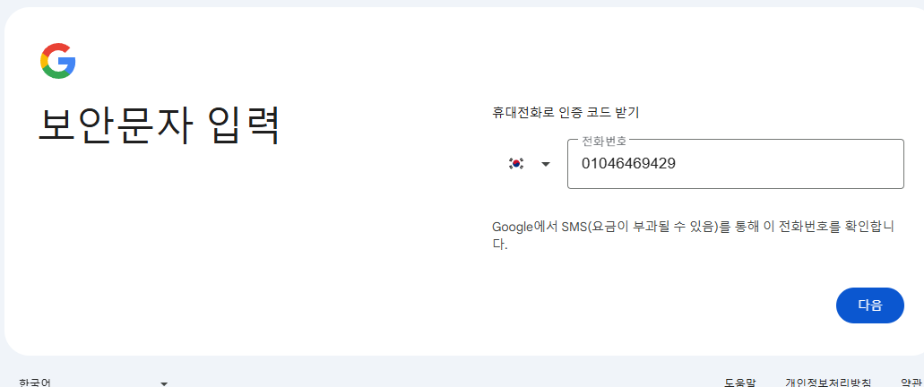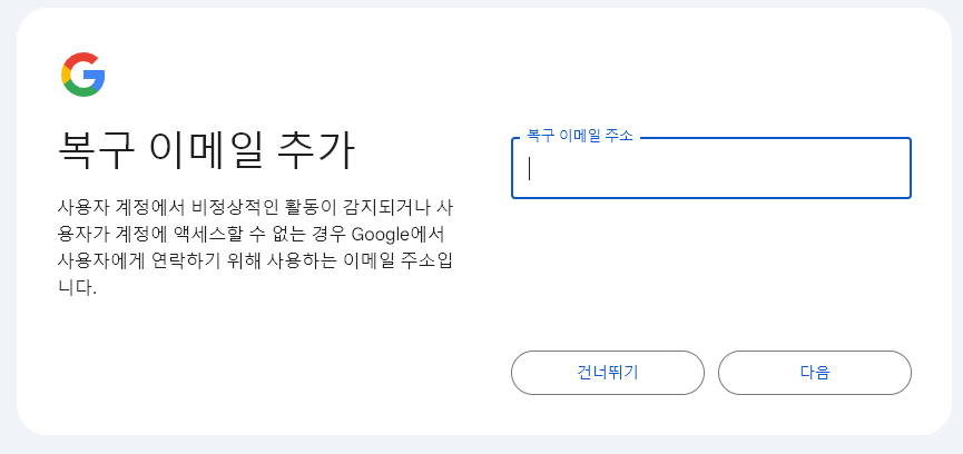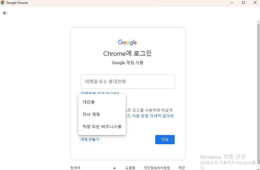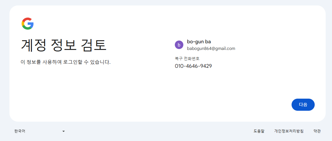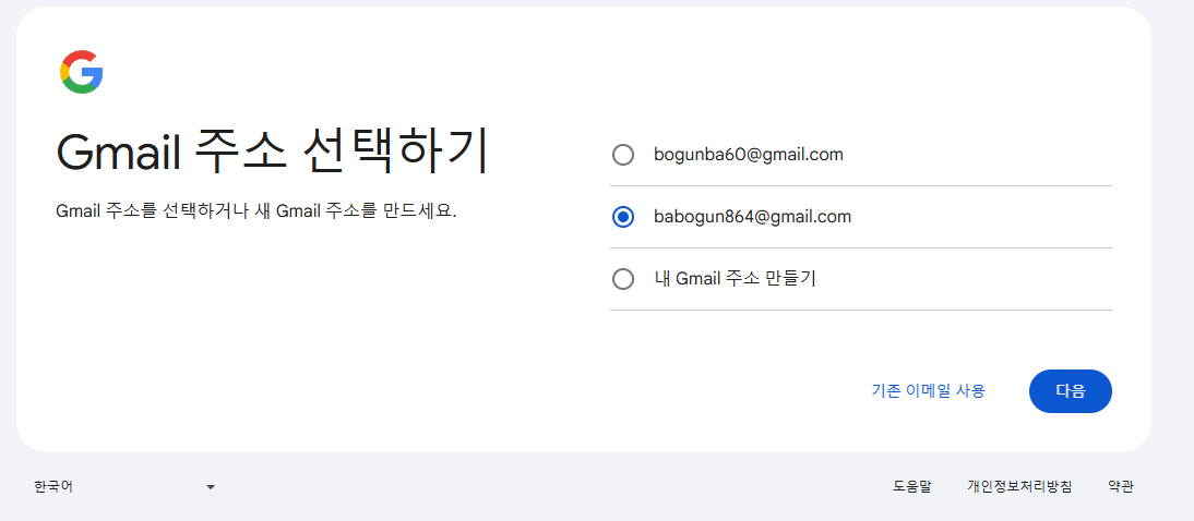 제공하는 gmail주소를 선택하거나, 자신이 직접 입력한 gmail을 입력하고 다음을 클릭합니다