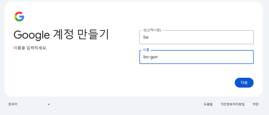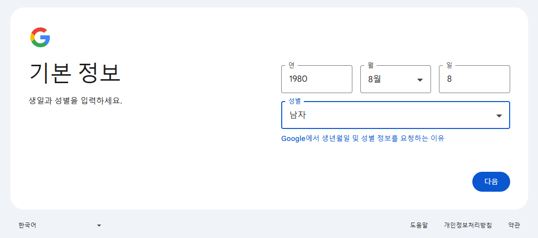 생년월일과 성별을 입력하고 다음을 클릭합니다.